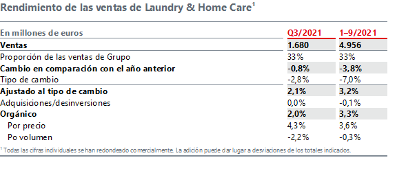 Durante los primeros nueve meses de 2021, la unidad de negocio Laundry & Home Care ha registrado un descenso nominal de las ventas de -3,8% hasta los 4.956 millones de euros. Orgánicamente, los negocios han conseguido fuertes crecimientos de las ventas del +3,3% impulsadas por el precio.