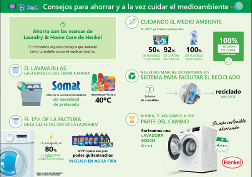 Con el objetivo de que el compromiso se mantenga a lo largo de todo el ciclo de vida del producto -desde su elaboración hasta su uso final-, las marcas de Henkel como Wipp Express, Micolor, Somat, Bref, Vernel y Dixan animan a los consumidores a optar por un estilo de vida responsable con el medio ambiente, poniéndose a su lado para ayudarles en este camino. Así, los consumidores pueden contribuir al medioambiente realizando un uso responsable de los productos, y también utilizándolos de forma más eficiente. Es por ello que las marcas Wipp Express, Micolor, Somat, Bref, Vernel y Dixan sortearán 50 lavadoras A+++ entre el 25 enero y el 18 de Abril del 2021 para ayudar a sus consumidores a mejorar el consumo de agua y eléctrico en el proceso de lavado de la ropa.