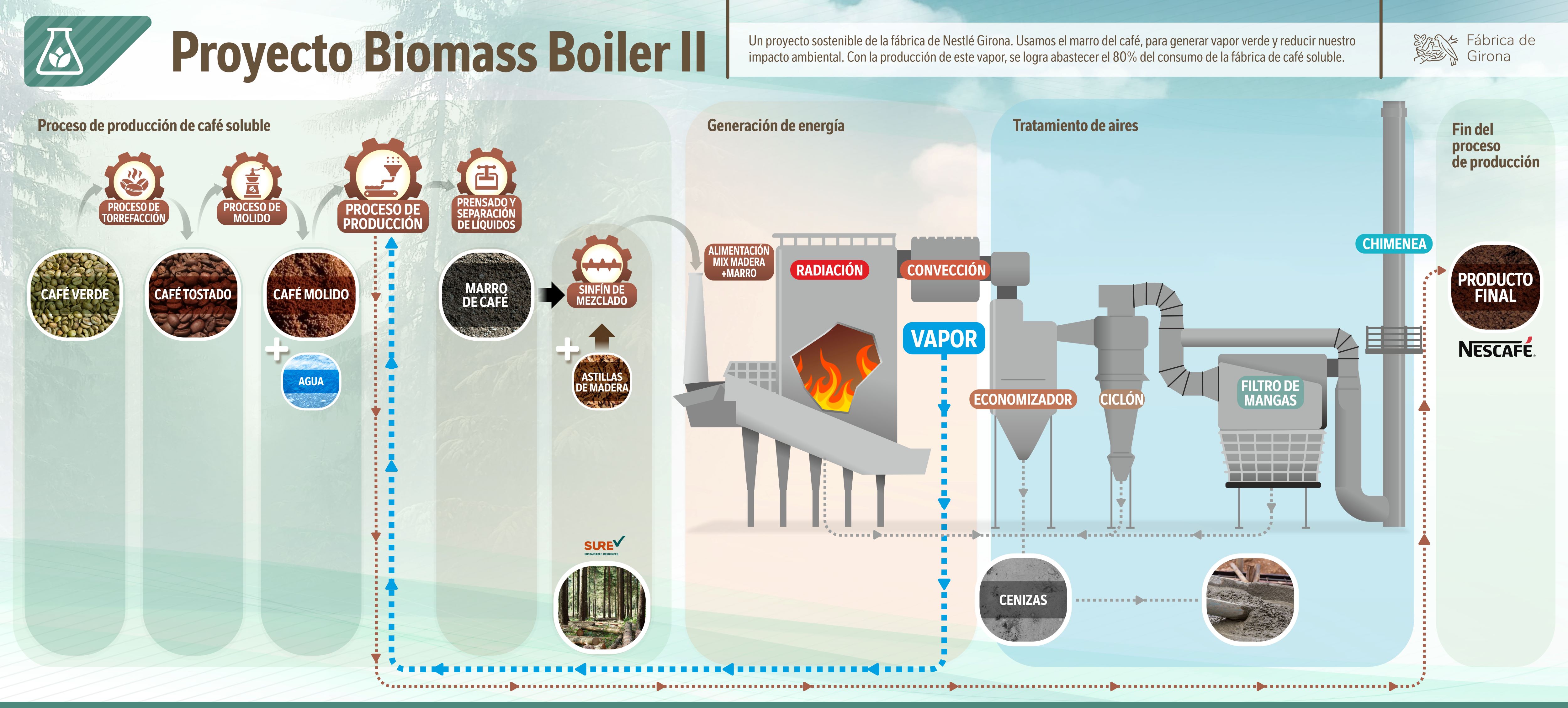 En la factoría, estos granos son limpiados y clasificados. A continuación, se desarrolla un proceso de torrefacción, con el que se consigue impulsar el sabor, la intensidad y el aroma. El café molido junto con el agua tratada son los dos ingredientes principales para la producción de Nescafé. Como resultado de este proceso, se obtienen posos de café que se convierten en la fuente de energía de la caldera de biomasa de la planta.