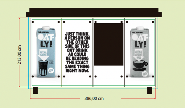 La campaña recurre también a la publicidad contextual a la manera habitual de Oatly con distintos mensajes adaptados en función de sus ubicaciones. De esta manera, se han lanzado mensajes haciendo referencia al formato publicitario: “Presentig the world´s first washable oat drink”, en tendederos; “Building a bus seeems like a lot of work just to show you this oat drink ad”, en publicidad en autobuses o “Power by oats and also legs” en el caso de las bicicletas públicas.