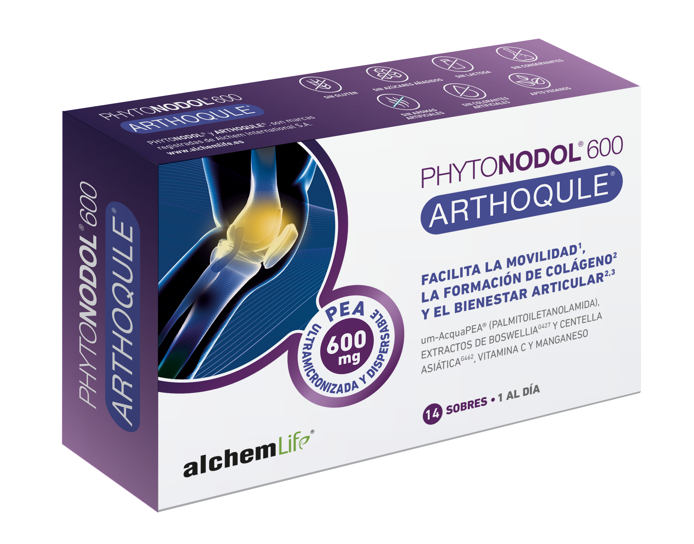 - Phytonodol®600 Arthoqule: sobres que se disuelven en agua formulados para el malestar crónico y el cuidado articular, ideal también como apoyo en procesos de recuperación tras actividad física intensa o sobrecarga estructural. Contiene PEA, extractos de Boswellia y Centella, además de Vitamina C y Manganeso, que contribuyen a la regeneración del cartílago y al mantenimiento del tejido conectivo.