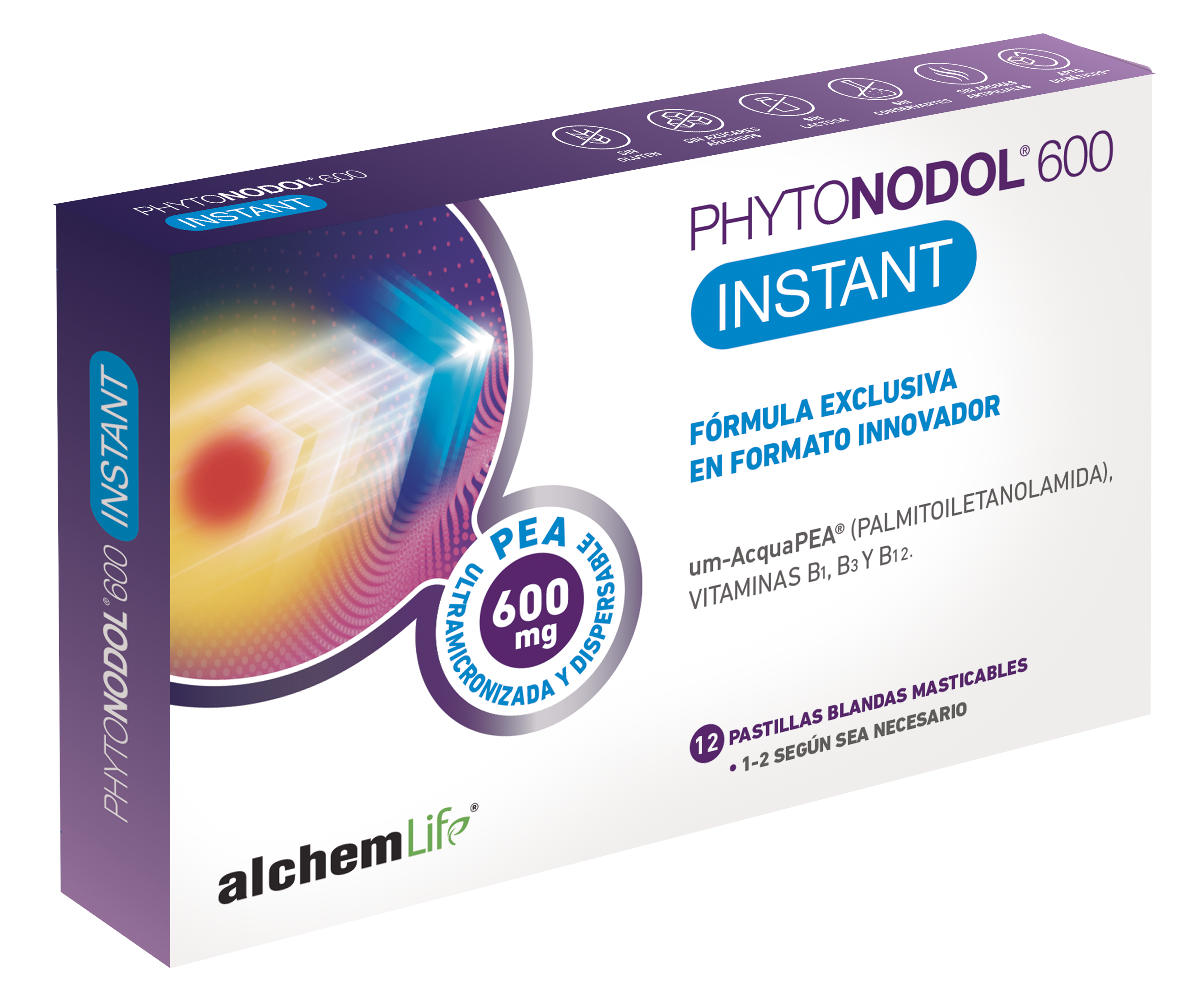 - Phytonodol®600 Instant: formulado con PEA y vitaminas del grupo B, son pastillas blandas masticables para malestar agudo, como molestias musculares puntuales, tensión cervical, sensación de piernas cargadas o incluso los días del ciclo menstrual. Gracias a su formato portable y agradable sabor, es ideal para llevar siempre encima y tomar al instante cuando aparece el malestar. Apto para adultos y niños a partir de 5 años.