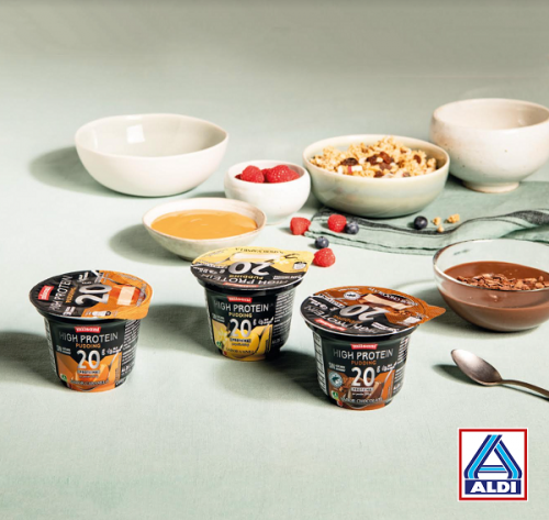 Entre las novedades de ALDI destaca una variedad opciones económicas altas en proteínas, como los pudding proteicos con sabor a chocolate, vainilla o caramelo (1,29 euros/200g). La nueva oferta de ALDI en esta categoría se complementa con propuestas bajas en grasa y sin azúcares añadidos, como las bebidas proteicas con sabor a chocolate o vainilla (1,39 euros/200g), y el yogur líquido alto en proteínas de frutas del bosque o fresa (1,19 euros/230g).