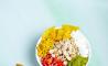 Pesto Lover: con base de pasta tricolor y espinacas y toppings de pollo, aceituna negra, tomate semiseco, dados de queso, huevo cocido y zanahoria + Salsa Mayo Pesto
