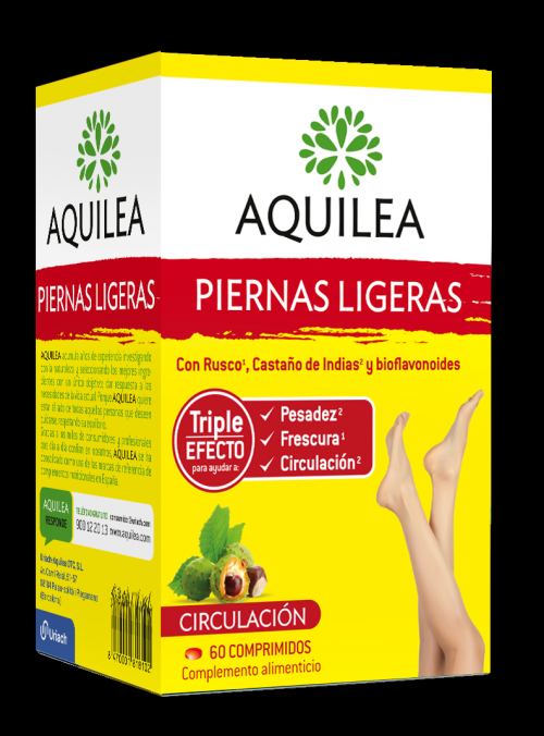 Aquilea presenta una fórmula innovadora que combina tres ingredientes naturales (bioflavonoides, castaño de indias y rusco) que ayudan a reducir esta sensación de piernas cansadas.