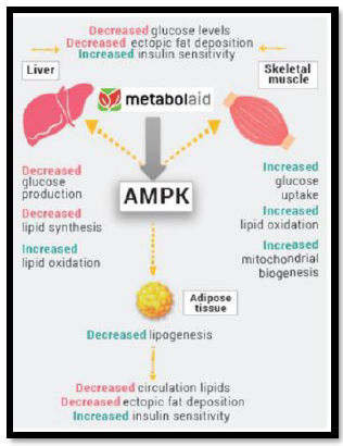 Los compuestos actúan sinérgicamente sobre varios tejidos, activando la AMPK (1), lo que lleva a favorecer el uso de las reservas energéticas propias del cuerpo sobre otras fuentes. Esos tejidos son: