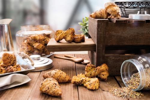 El Croissant Multicereal está compuesto por semillas de girasol, lino y sésamo, copos de avena y trigo en masa, y un topping de semillas de lino moreno, lino amarillo, sésamo, mijo y amapola.
