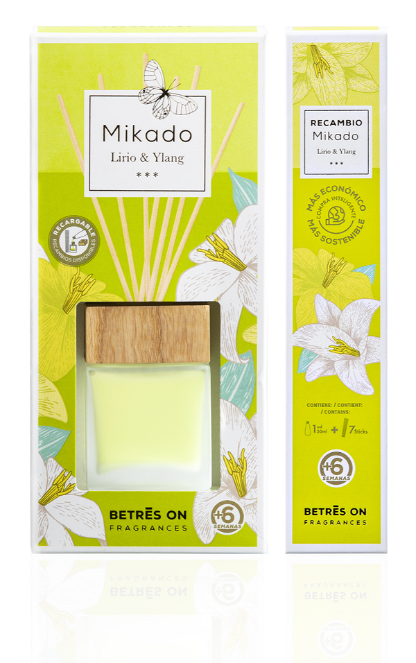 Mikado & Lirio Ylang, es una delicada y suave fragancia que combina el perfume del Lirio envuelto en suaves notas de “la flor de flores”, Ylang