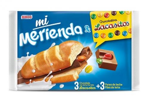 La actual Mi Merienda está compuesta por un tierno pan de leche de BIMBO y una sabrosa y crujiente chocolatina rellena de Lacasitos, fruto de una acción de cobranding entre ambas marcas. Como novedad, la chocolatina puede ser de chocolate con leche o de chocolate blanco. Con esta combinación de los dos productos, los niños disfrutan de una merienda nutritiva, deliciosa y muy divertida, y gracias al envasado individual del producto se lo pueden llevar a cualquier lugar sin que pierda ternura ni sabor.
