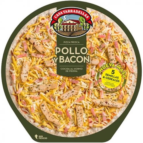 Casa Tarradellas, marca líder en la elaboración de pizzas refrigeradas en España, presenta la PIZZA POLLO Y BACON CON MASA 5 CEREALES Y SEMILLAS. La nueva receta sorprende por la cuidada preparación del pollo asado, que aporta un sabor intenso al paladar, que combina a la perfección con el bacon Casa Tarradellas y el resto de ingredientes de esta pizza: virutas de queso mozzarella, cheddar y su clásica salsa de tomate natural. Todo ello, con la garantía de la frescura y la calidad de los mejores ingredientes que incorpora siempre Casa Tarradellas.