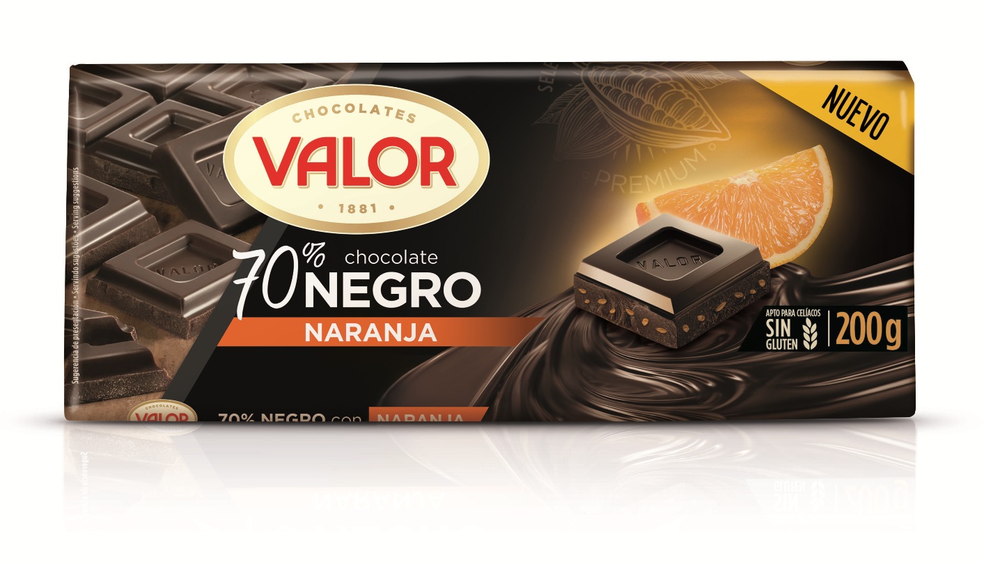 Chocolates Valor, amplía su gama de tabletas más icónica con dos nuevos productos. Para la marca, líder del mercado de chocolate negro con más del 30% de cuota de mercado, y que continua creciendo a un ritmo del 9%, ha llegado el momento de ampliar la familia con dos deliciosas propuestas de chocolate negro 70% cacao, las tabletas Negro 70% Naranja y Negro 70% Caramelo y Sal.