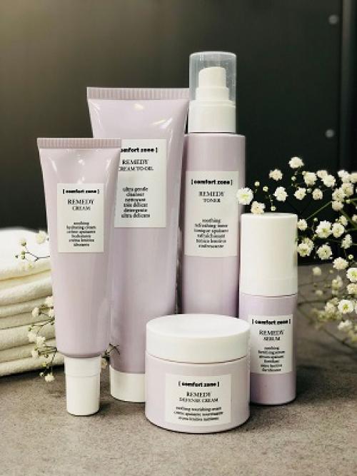 REMEDY es la nueva línea de [ comfort zone ] para el cuidado en casa y tratamientos profesionales destinados a la piel sensible y sensibilizada, que ha sido estudiada con el apoyo del Comité Científico que respalda el sector Investigación y Desarrollo interno de la empresa, y en particular, con la contribución de la Nutridermatóloga Maria Bucci y de la Neuróloga americana Claudia Aguirre. Fórmulas ultra delicadas, ricas en principios activos de origen natural, que calman la neuroinflamación e incrementan la capacidad defensiva de la barrera cutánea.
