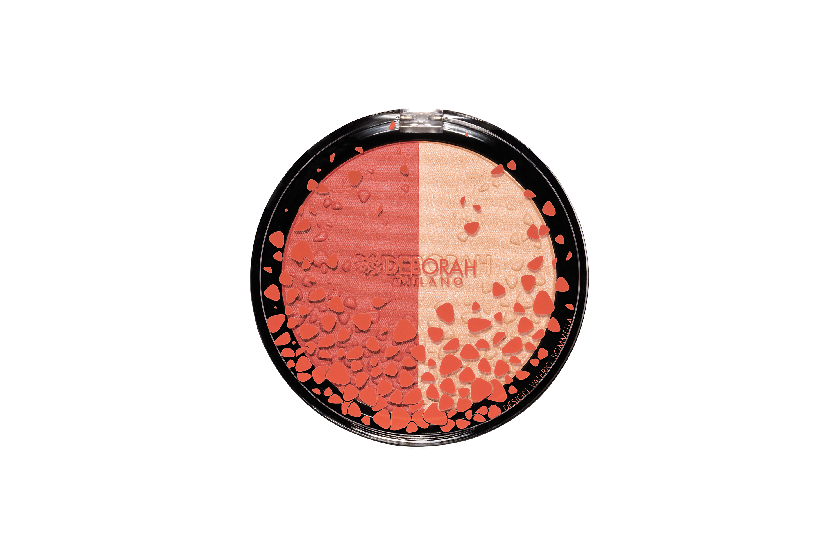 De un lado, un colorete para resaltar pómulos, del otro, un iluminador para resaltar pómulos, sienes y cejas. Los dos colores pueden perfectamente mezclarse o usarse por separado.