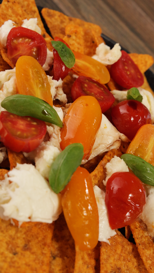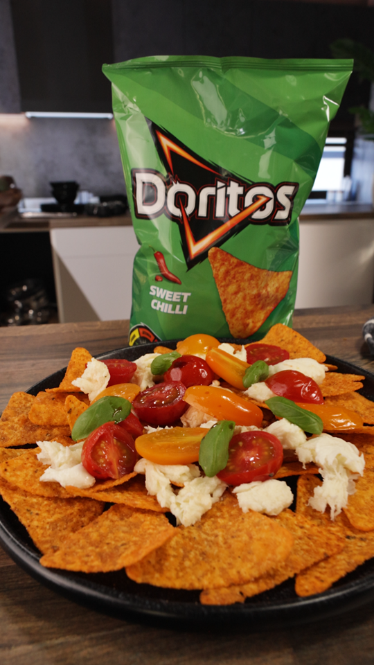- Doritos Loaded’ Caprese: Una versión crujiente y divertida de la clásica ensalada Caprese, reinventada con el toque de Doritos. La receta propone tomates cherry de colores asados con aceite de oliva y vinagre balsámico. Estos se añaden a una base de Doritos o Doritos® Sweet Chili® y mozzarella fresca y se combinan con albahaca, ofreciendo una explosión de textura y sabor.