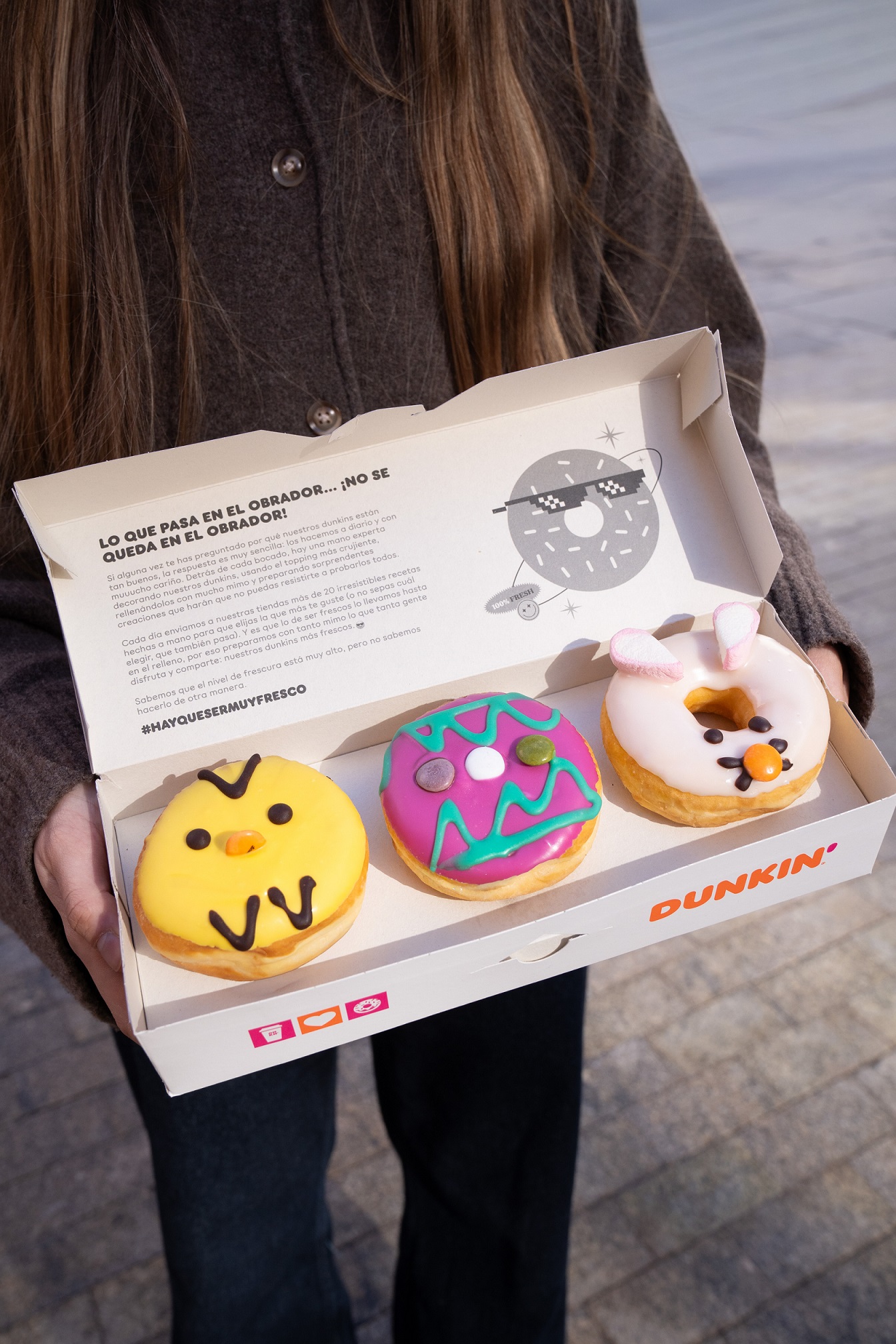 Por un lado, presenta Dunkin Conejito, un anillo cubierto de chocolate blanco, decorado con chocolates y nubes que dan forma a un tierno conejo de pascua. Le acompaña Dunkin Pollito, una concha rellena de chocolate blanco cubierta de icing de vainilla, decorada con un Lacasito y detalles de chocolate, que recrean la cara de un simpático pollito. Y por último, Dunkin Huevo, inspirado en los tradicionales huevos de Pascua: una concha rellena de crema de choco-avellana, cubierta con icing de vainilla y decorado con Lacasitos.