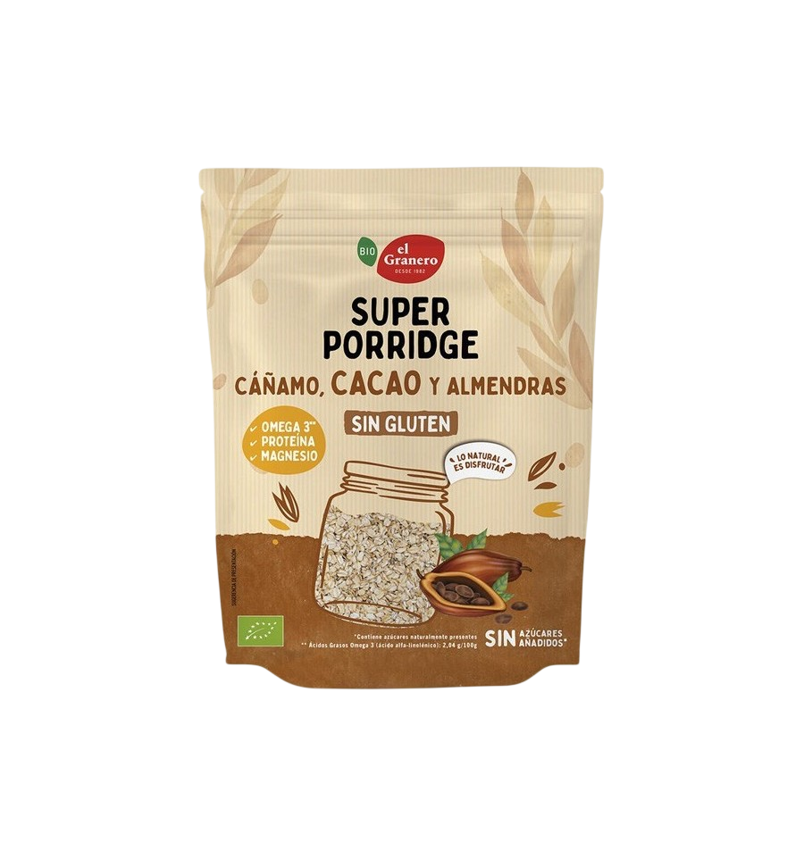 • Superporridge cacao bio y sin gluten, con semillas de cáñamo pelado, almendras y cacao en polvo. Destaca por su alto contenido en fibra y su aporte de magnesio, un mineral que contribuye a reducir el cansancio y la fatiga y al correcto funcionamiento de músculos y huesos. Además, es fuente de Omega 3 y fibra.