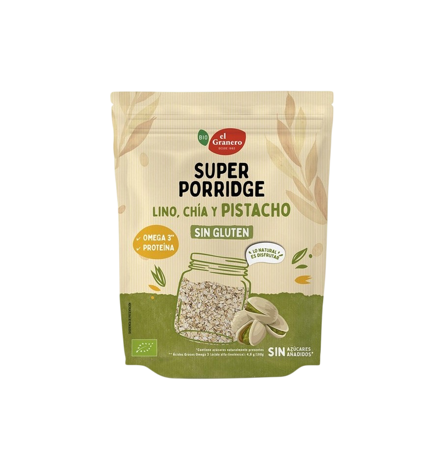 • Superporridge pistacho bio y sin gluten, una propuesta innovadora y única, con trozos de pistacho y semillas de lino y chía molidas. Es fuente de proteínas vegetales y Omega 3, con alto contenido en fibra, lo que contribuye a la saciedad y al equilibrio digestivo, sin renunciar al disfrute.