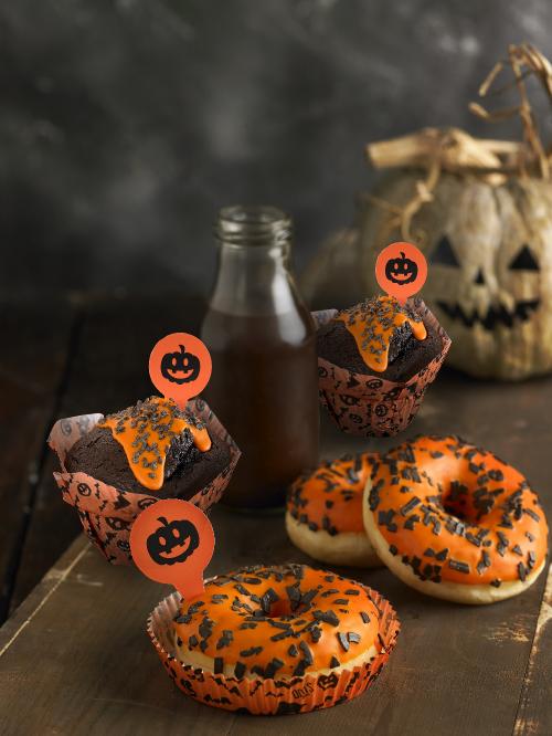 Muffin con masa y relleno de cacao, cobertura de azúcar de color naranja y toppin de virutas de chocolate. Decorado con un pirotino con motivos de Halloween y un pincho con forma de calabaza.