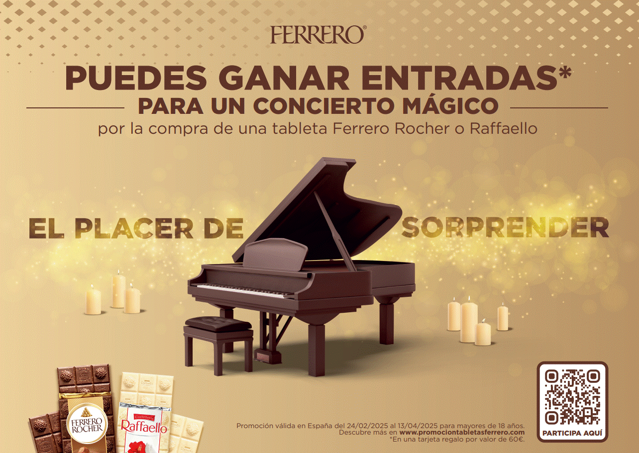 Para que tu experiencia sea aún más inolvidable, por la compra de cualquier tableta Ferrero Rocher o Raffaello, podrás participar en un sorteo exclusivo. ¿El premio? 40 entradas para un concierto mágico, celebrado en escenarios únicos que, al igual que nuestras tabletas, están pensados para sorprenderte con su dulce placer.