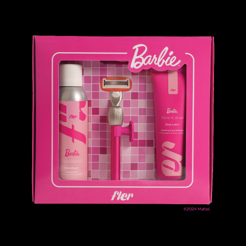 Diseñado en un irresistible rosa Barbie, el set incluye la mítica maquinilla Fler en versión pink edition, con mango ergonómico y estuche a juego, a los que se suman dos imprescindibles de la marca: Foamtastic Coconut y Slow It Down, reeditados para la ocasión con un nuevo look vibrante y audaz. Todo, en un packaging que evoca sin complejos la estética pop de Barbie® con el refinamiento característico de Fler.