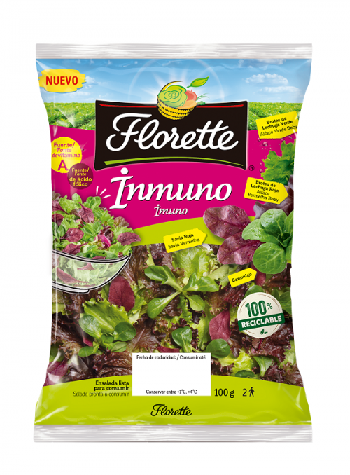 Florette cuenta ya entre su extensa gama de productos frescos con las ensaladas funcionales Detox, Antiox y Activa, referencias que destacan por sus propiedades beneficiosas para la salud. Ahora, consciente de los hábitos y prioridades de los españoles preocupados por su sistema inmunitario y manteniendo su misión de ayudar a las personas a alimentarse mejor, la empresa navarra lanza Inmuno. Esta nueva ensalada de brotes frescos y tiernos contiene una mezcla de canónigo, brotes de lechuga verde y roja y savia roja. Este último ingrediente destaca por su color burdeos, que hará que tus ensaladas sean de lo más llamativas y apetecibles. El toque de sabor a avellana que aporta el canónigo junto a la suavidad de los brotes de lechuga y de la savia roja darán a tus platos un sabor intenso e inesperado que sorprenderá a todos los paladares.