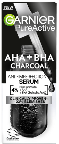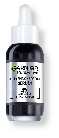 El Sérum AHA + BHA Anti-imperfecciones Pure Active de Garnier contiene un 4% de activos imprescindibles para el cuidado de la piel con tendencia acneica o con imperfecciones: