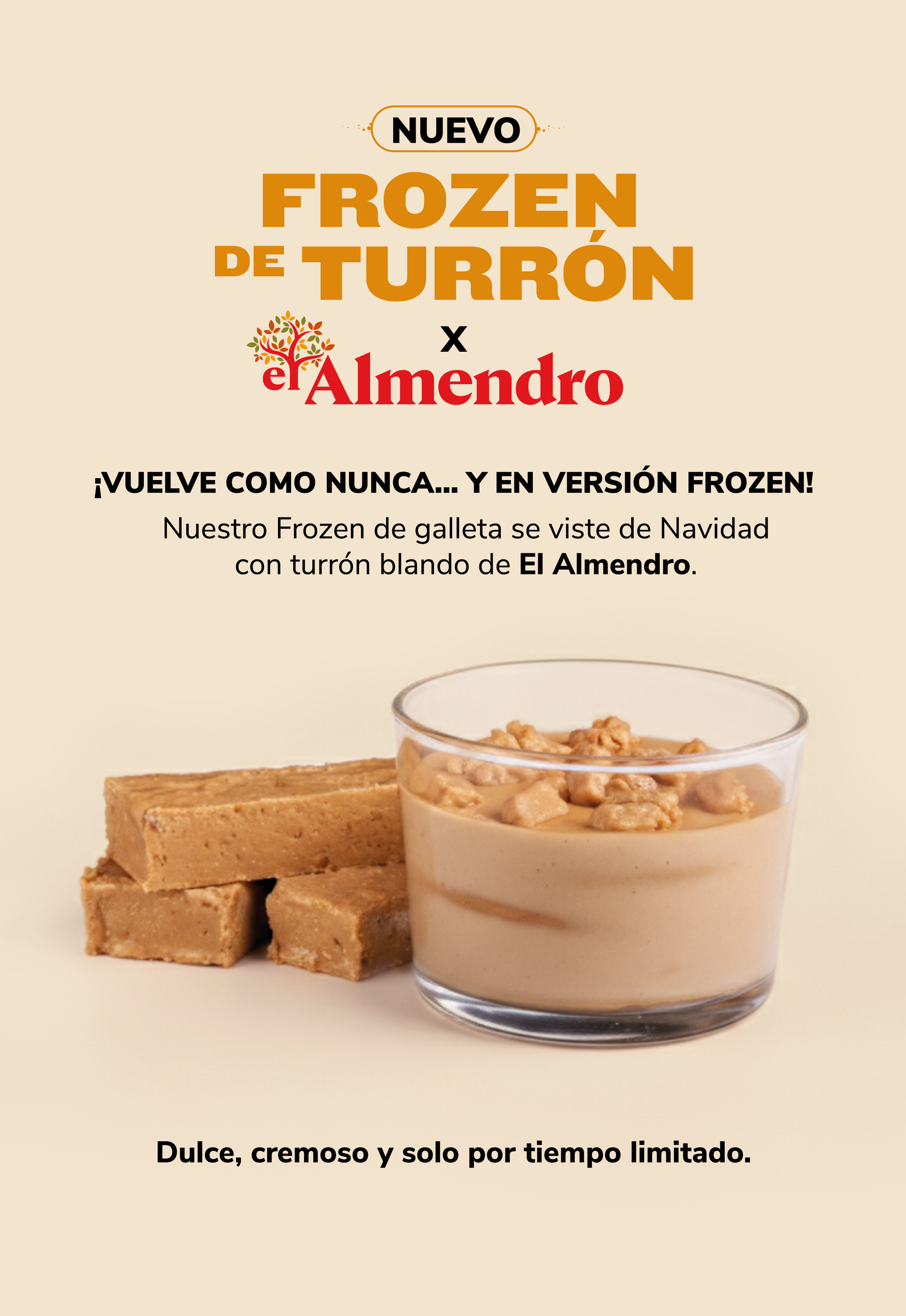 El FROZEN DE TURRÓN x El Almendro estará disponible del jueves 4 de diciembre de 2025 al domingo 11 de enero de 2026 en todos los restaurantes GOIKO y en GOIKO Gluten Free, excepto en el local del aeropuerto de Mallorca.