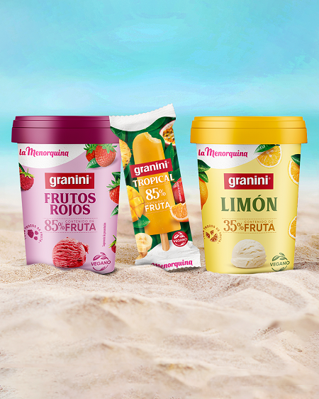 En esta temporada granini y La Menorquina se unen para ofrecer los mejores sabores: limón, frutos rojos y sabor tropical hechos hasta en un 85% a base de pura fruta, ¡para disfrutar!