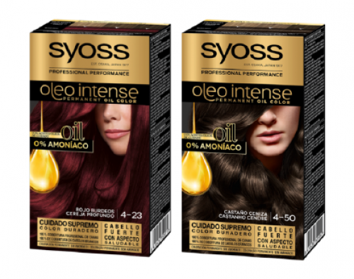Syoss Oleo Intense también apuesta por incluir dos nuevos tonos en tendencia a su colección: el tono castaño ceniza 4-50, un tono frío de aspecto natural que da calidez al color del cabello; y por el rojo burdeos 4-23, un color vibrante, atrevido y con mucha personalidad.