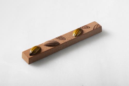 El nuevo turrón "Quetzalcóatl" destaca por su cuidada composición de tres texturas, una combinación poco habitual en el universo de los turrones artesanales y que lo convierte en una pieza exclusiva. En su interior se encuentra una ganache de caramelo especiado; un compota exótica de fruta de la pasión, albaricoque y yuzu; y una gianduja crujiente de almendra.