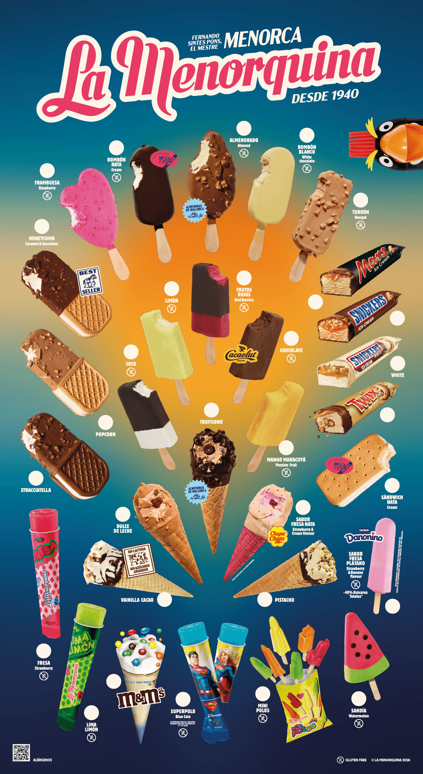 El cartel de impulso para 2026 presenta 15 nuevos helados. Destacan tres bombones de formas reconocibles, recuperando la libertad de formas que han tenido siempre los maestros chocolateros: el almendrado, que reproduce la silueta de la almendra; el de frambuesa, con forma de frambuesa y, según la perspectiva, también asimilado a un corazón; y el que parece un corte de turrón, un sabor nuevo e inspirado en este dulce tradicional.