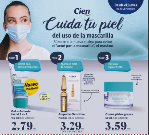 Esta nueva propuesta viene a dar respuesta a los daños que está sufriendo la población como picores, sarpullidos, erupciones, manchas o el acné debido al uso prolongado de las mascarillas. La rutina facial Maskné de CIEN consta de tres productos; una crema hidratante facial matificante antibrillos o multiacción para piel grasa con tendencia acneica, un gel facial exfoliante y unas ampollas para pieles sensibles con activos que refuerzan la barrera cutánea. Según datos de BBC News, cada vez son más las personas afectadas por el acné debido al uso de las mascarillas. La dermatóloga Amy Kassouf, de la Cleveland Clínic, apunta ”el acné por mascarilla siempre ha sido un problema en profesionales que las usan regularmente para desempeñar su trabajo, pero ahora esta problemática se ha extendido a la población general.” Por ello, estas soluciones son más que demandadas por los clientes, ya que las mascarillas es el símbolo por excelencia de la nueva normalidad. Lidl ha querido ofrecer a sus clientes una solución asequible y con la mejor relación calidad-precio para cubrir esta nueva necesidad.