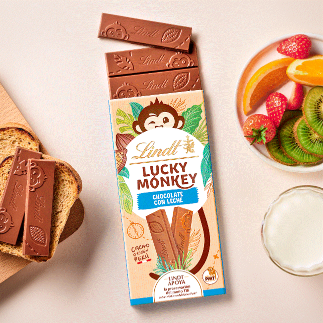 La reconocida compañía suiza de chocolate premium Lindt & Sprüngli lanza en España Lindt LUCKY MONKEY, su primera tableta de chocolate diseñada para disfrutar en familia y elaborada con un 100% de cacao fino peruano. Este producto aspira a conquistar los paladares de toda la familia y convertirse en la tableta de referencia para cualquier ocasión.