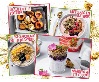 Muy fáciles de incorporar a la dieta diaria y conseguir un extra de nutrientes, basta con añadir 2 cucharadas a cualquier comida del día. En postres, cereales, batidos, como topping en yogur… ¡Añade a tus platos un toque crujiente y sabroso!