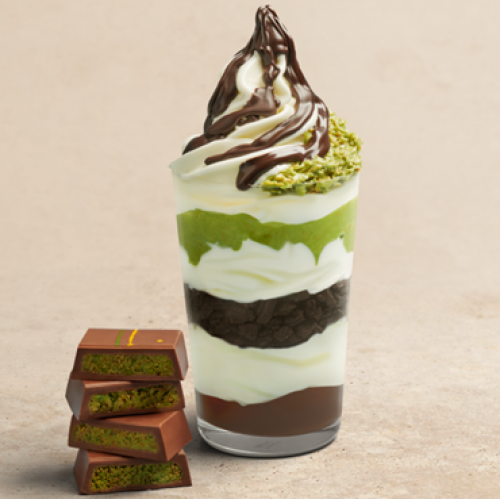 La combinación ofrece una experiencia que despierta todos los sentidos para permitirte experimentar y saborear más: el chocolate negro aporta intensidad y notas especiadas, mientras que el yogurt helado aporta la parte de frescura y acidez suave. El topping Kataifi Dream añade textura crujiente y una explosión de sabor que completa la receta con un toque de lo más luxury.