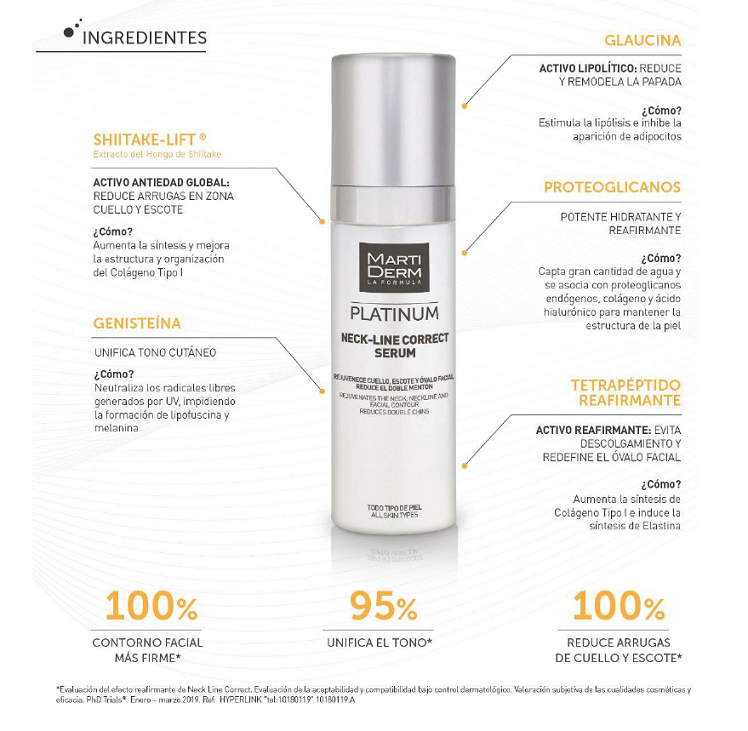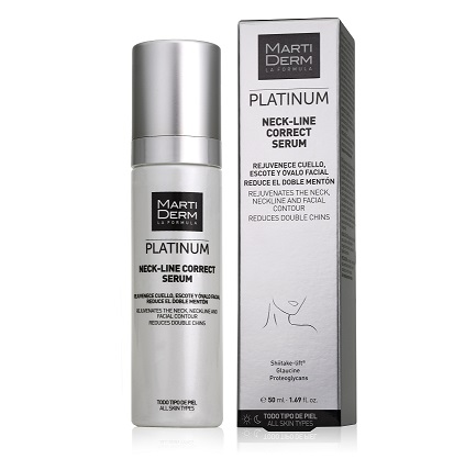El laboratorio MartiDerm, teniendo en cuenta que esta zona es una de las grandes olvidadas en la rutina diaria de belleza, ha creado Neck Line Correct Serum, un producto que se suma a la línea Platinum, que lucha contra el envejecimiento consiguiendo dar una respuesta adaptada a esta delicada zona. Un producto de textura fluida y acabado sedoso, de fácil aplicación y absorción, que rejuvenece cuello, escote y óvalo facial reafirmando, unificando el tono, atenuando arrugas y reduciendo el doble mentón. Un aliado imprecindible a la vanguardia dermocosmética.