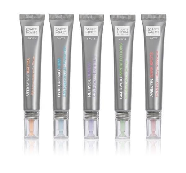 Siempre a la vanguardia dermocosmética, MartiDerm presenta SHOTS, 5 nuevos potenciadores con activos altamente concentrados para cubrir las necesidades puntuales de la piel. 5 productos que complementan la rutina diaria para conseguir resultados precisos según las necesidades particulares de cada persona, ya sea de manera constante o puntual gracias a sus exclusivas combinaciones, cuya sinergia de activos maximiza su eficacia. Sus texturas se funden rápidamente en la piel sin interrumpir los pasos anteriores (limpieza, tonificación…) ni posteriores (serum, crema, Spf…), sino que se suman a estos para conseguir resultados probados.