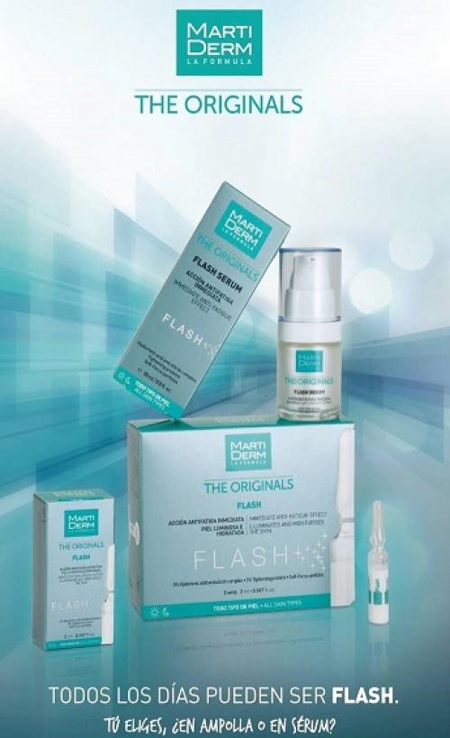 El laboratorio MartiDerm, siempre a la vanguardia en la investigación de los efectos del envejecimiento cutáneo y la formulación de productos destinados al cuidado de la piel, renueva su mítica ampollas FLASH y presenta también FLASH SERUM, dos productos faciales con un efecto de belleza inmediato anti-fatiga, hidratantes, reafirmantes y que aportan una luminosidad legendaria y ayudan a fijar el maquillaje más y mejor.