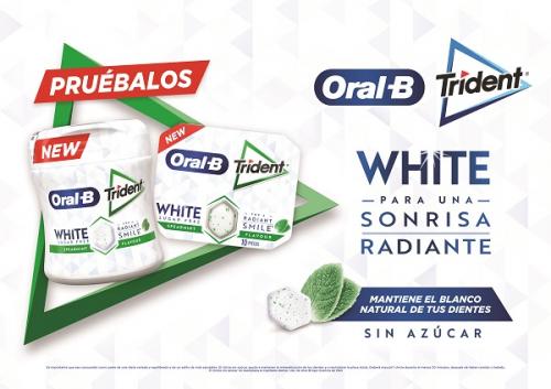 Los nuevos chicles Trident Oral -B White que presenta la marca Mondelēz International, una de las mayores empresas de alimentación en el mundo, reducen las manchas superficiales de los dientes ayudando a mantener su blanco natural, gracias a su ingrediente activo científicamente probado. Trident Oral-B White combina todo el frescor de los chicles Trident con la eficacia de Oral-B, en un chicle sabor hierbabuena, disponible en formato unitario de 17gr como en cómodos botes de 68gr.