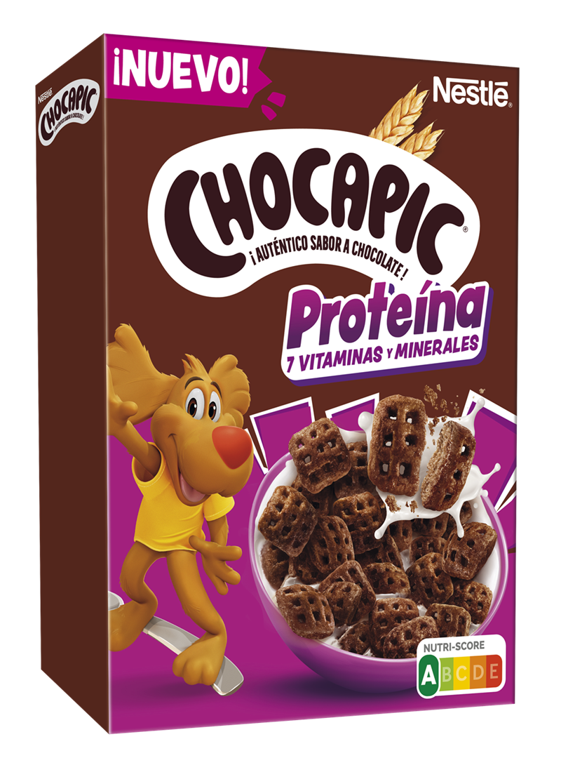 Chocapic Proteína mantiene el auténtico sabor a chocolate que lo ha convertido en un clásico, ahora en una crujiente forma de gofre, con 7 vitaminas y minerales, fuente de proteína y un Nutri-Score A que lo convierte en una opción equilibrada para toda la familia.
