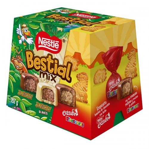 NESTLÉ Bestial Mix se elabora en la fábrica de Nestlé en La Penilla de Cayón (Cantabria) y se presenta al mercado en una caja de cartón con apertura en flor de 187 g 15 bombones, 5 de cada variedad.