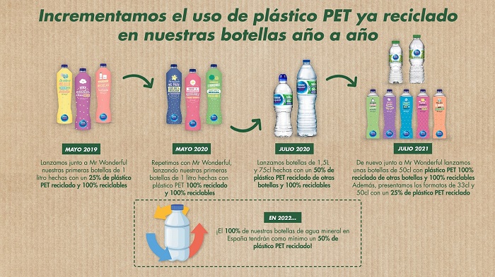 La división de aguas de Nestlé está trabajando para que en España todas sus botellas, que ya son 100% reciclables, contengan como mínimo un 50% de plástico ya reciclado (rPET) para 2022.