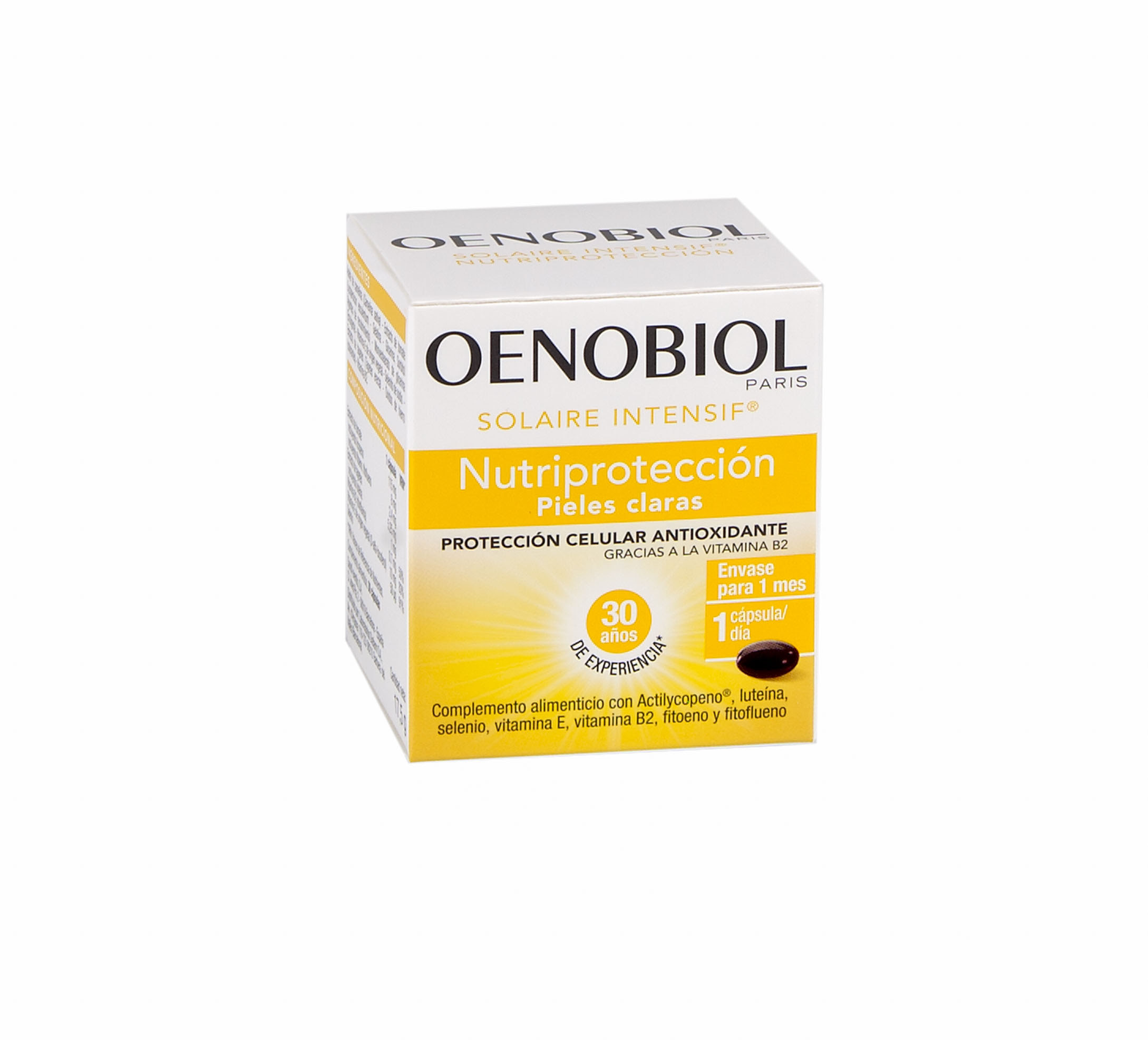 OENOBIOL SOLAIRE INTENSIF Nutriprotección Pieles Claraste asegura un bronceado bonito y progresivo, aportando la protección que tu piel necesita. Para conseguirlo y tolerar mejor la exposición a los rayos solares lo ideal es comenzar a tomarlo un mes antes de la exposición y continuar con el tratamiento durante y un mes después de la misma. Su efectividad radica en su fórmula: