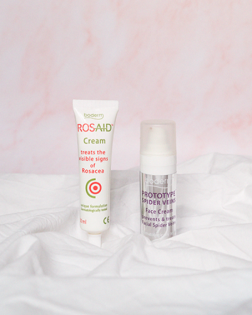 Se trata de una combinación ganadora que une la acción de Rosaid, un tratamiento multifactorial que ayuda a controlar todos los aspectos de una piel que cursa con rosácea tales como el eritema, la irritación, el picor y el escozor, además de controlar y mantener la piel hidratada y protegida; junto con Prototype Spider Veins, el primer y único producto sanitario para el tratamiento de las arañas vasculares faciales. Su acción combate eficazmente la inflamación, mejora la circulación sanguínea y ejerce una acción descongestiva, hidratante, regeneradora y cicatrizante.