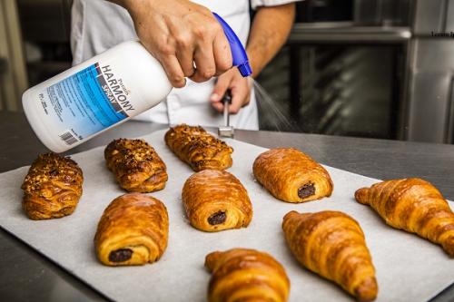 Harmony Spray cuenta con un preparado especial de sabor neutro y debe aplicarse sobre piezas recién sacadas del horno para conseguir resultados óptimos. Es un producto pensado para todo tipo de bollería: croissant, napolitana, hojaldre…así como para el pegado de toppings en la superficie. Este producto está enfocado al sector industrial y QSR con el objetivo de que el cliente cree unas piezas relucientes y muy atractivas a los ojos de los consumidores de la manera más sencilla y segura posible.