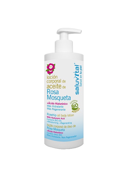 Es de sus semillas de las que se obtiene el preciado aceite de rosa mosqueta. Se trata de un líquido ámbar lleno de nutrientes como el retinol, la vitamina C, flavonoides, taninos, betacarotenos o ácidos linolénicos, linoleicos y oleicos. Por ello, es muy utilizado en dermocosmética, tanto por sus grandes propiedades para la piel como por su eficacia regeneradora y reparadora: ayuda a la eliminación de manchas, suaviza cicatrices y contiene potentes antioxidantes. Saluvital Loción Corporal con aceite de rosa mosqueta y ácido hialurónico - PVPR 450 ml: 10,25 €. De venta en farmacias y en www.saluvital.es