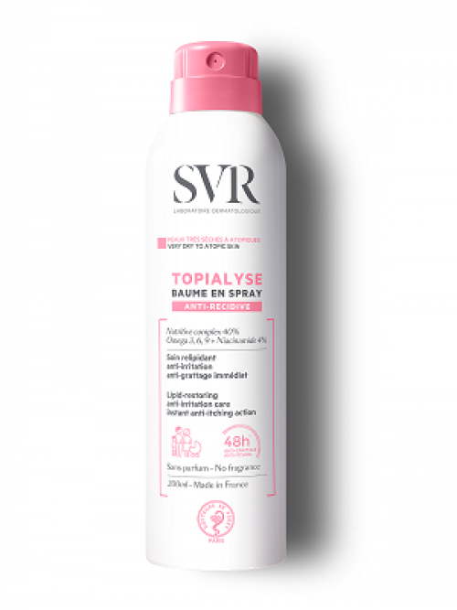 SVR, laboratorio dermatológico que desarrolla sus fórmulas con la mayor concentración de ingredientes activos, crea el primer spray2 para el cuidado de las pieles atópicas con difusor 360º y eficacia 48h anti-picor que incluso los niños pueden usar por sí mismos. Topialyse Baume en Spray es una innovación que mejora sustancialmente la aplicación de este producto calmante en pieles atópicas.