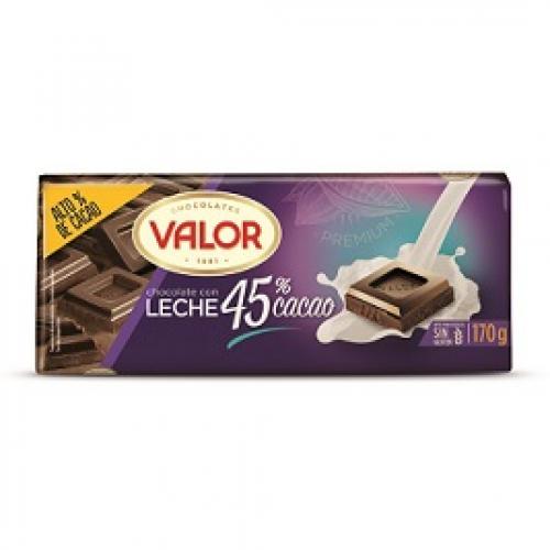 - Leche 45% cacao, en formato 170 g., donde el alto porcentaje de cacao permite experimentar la intensidad y los matices del blend Valor, elaborado con algunos de los mejores cacaos del mundo, mientras la leche aporta la cremosidad y el dulzor clásico del chocolate con leche.