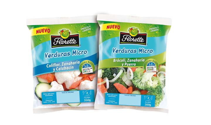 La compañía Vega Mayor ha lanzado al mercado su nueva gama para cocinar en microondas Verduras Micro de la marca Florette. La línea se compone de dos referencias: Brócoli, Zanahoria y Puerro; y Coliflor, Zanahoria y Calabacín. Las verduras se cocinan en su propio vapor en el microondas de una manera muy sencilla, pues basta con colocar la bolsa sin abrir ni perforar dentro del microondas y esperar cinco minutos para que estén listas para su consumo. La bolsa funciona a su vez como recipiente para cocinar, permitiendo su cocción directamente en ella.