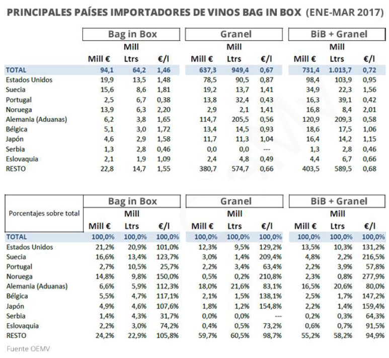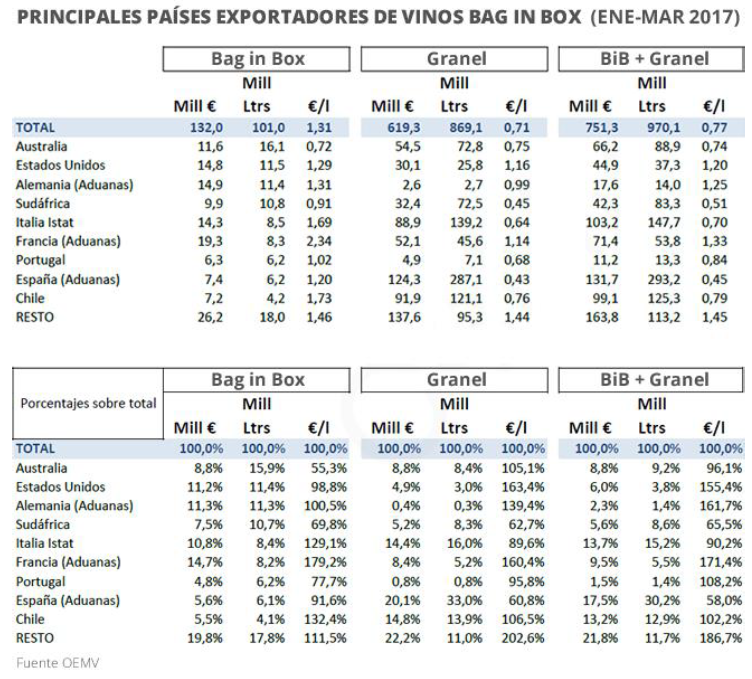 Las exportaciones mundiales de vinos en envases entre 2 y 10 litros, que mayoritariamente pueden referirse a las realizadas en envases "bag in box" (BiB), alcanzaron durante el primer trimestre de 2017 un volumen de 101 millones de litros por valor de 132 millones de euros a un precio medio de 1,31 /litro.